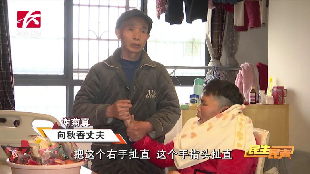▲向秋风丈夫谢菊真介绍,每天要为妻子做两个小时的康复