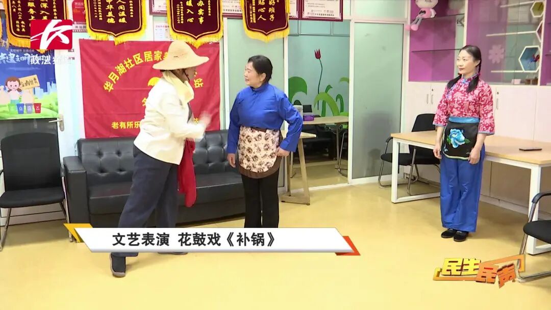 换好衣服化好妆,在华月湖社区居家养老服务站,一场专属于老人们的花鼓戏演出拉开了帷幕。其中一名演员名叫黎跃平,今年67岁,她是华月湖社区的居民,也是一名党员志愿者。