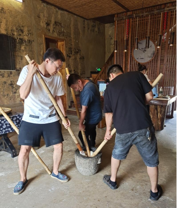 走进一栋民宿,几个年轻人正抡起粗木棒、喊着号子打糍粑,加入黄豆粉、花生碎后,再分条、切块,可口的非遗美食糍粑就新鲜制成。